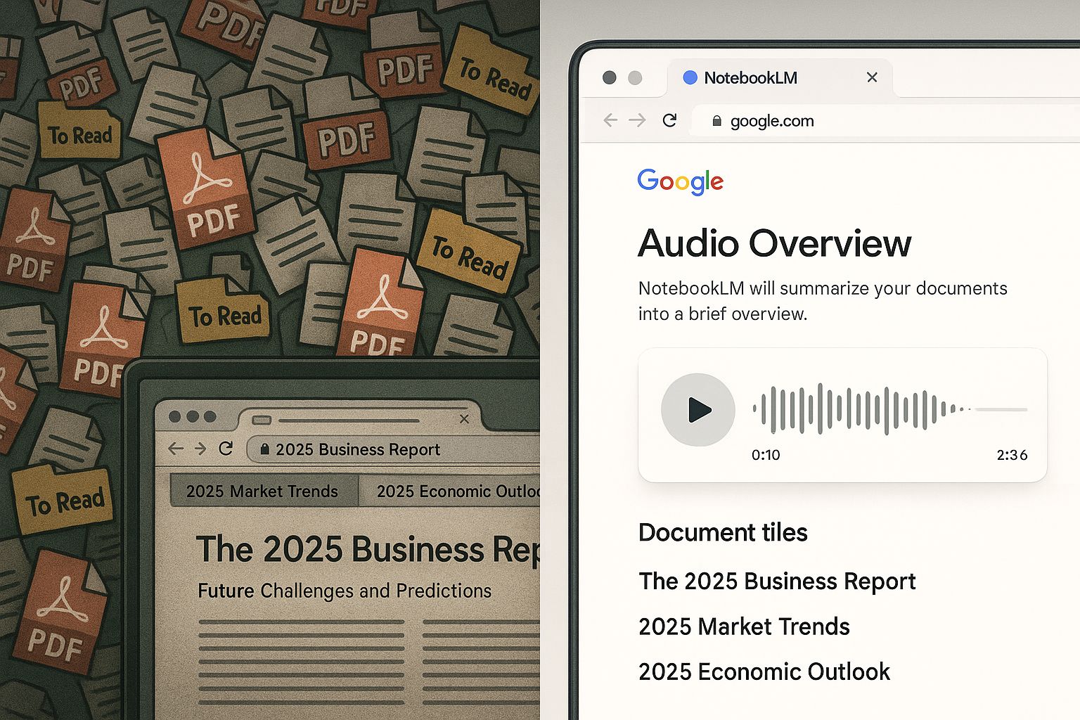 Say goodbye to that pile of unread PDFs taunting you from your desktop. NotebookLM's Audio Overview feature is like having two AI experts discuss your business documents while you drive to work.